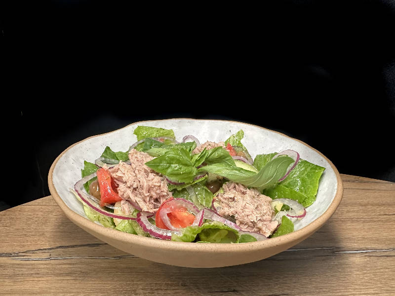 картофель отварной, тунец в масле, оливки таджаски, лук крымский, помидоры, огурцы, салат романо, каперсы, базилик, ол. масло